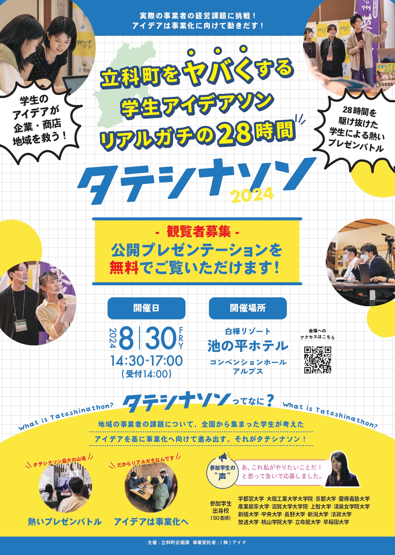 「タテシナソン – 立科町をヤバくする学生アイデアソン リアルガチの28時間 -」公開プレゼンテーションオーディエンス募集!