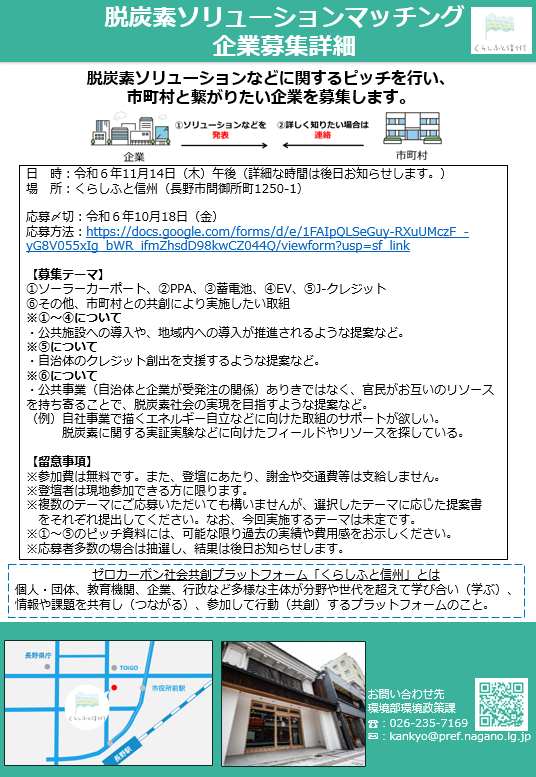 ゼロカーボン社会共創プラットフォーム「くらしふと信州」では、県内市町村と民間企業とのネットワーキングを目的として、ピッチイベントを開催します。