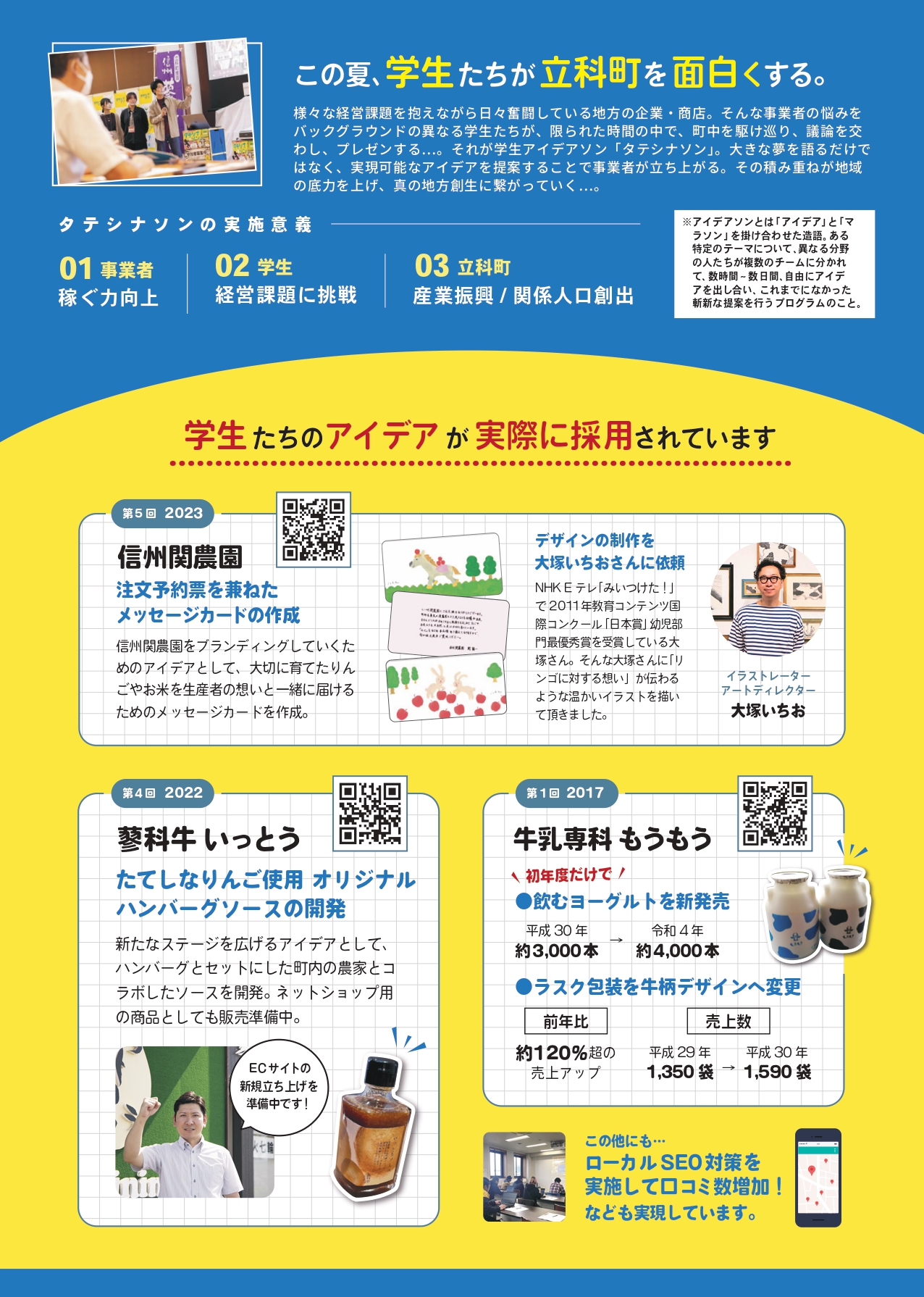 日々奮闘している地方の企業や商店の経営テーマについて、全国から集まった学生たちが、わずか28時間で練り上げたアイデアで解決策をプレゼンテーションする学生アイデアソンが「タテシナソン」です。これまでの開催で提案されたアイデアは事業化に移され、事業者の稼ぐ力向上に役立っています。