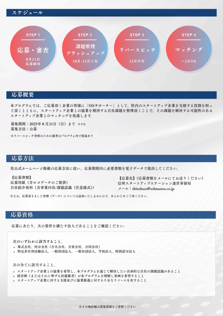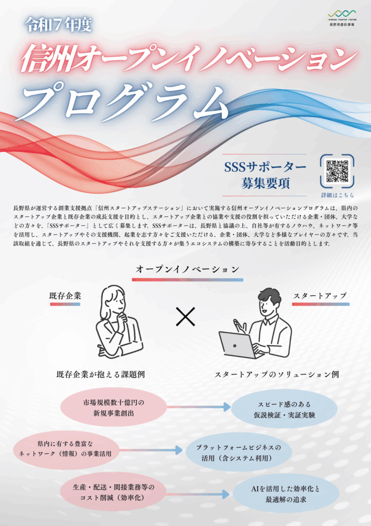 県では、新たに県内のスタートアップと既存企業の成長を支援するため、スタートアップとの協業や支援の役割を担う企業等を「信州スタートアップサポート企業(SSSサポーター)」として募集します。