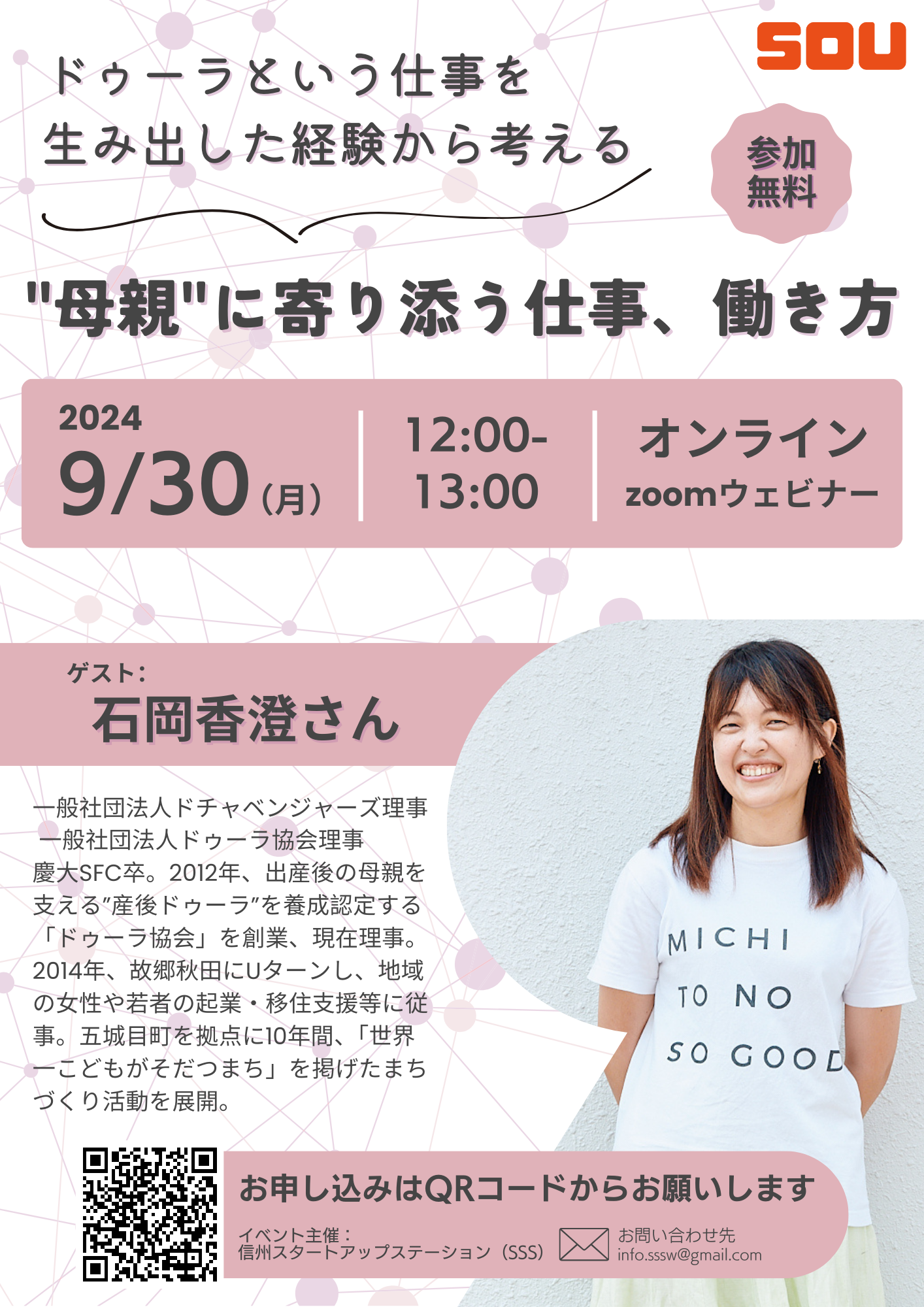 今回、本セミナーでは、「子育てに励むお母さんに寄り添いたい。」そんな願いから起業された、一般社団法人ドゥーラ協会設立者である石岡香澄さんをお呼びし、「母親に寄り添う仕事」を創出した経験を通じて、日本の「母親」の現状についてや、自身の起業までのプロセス。また、母親が仕事をする、特に起業をする際の課題や意識すべきポイントはなにか?それに伴う必要なサポートについてなど、ざっくばらんにお話をお聞きします!