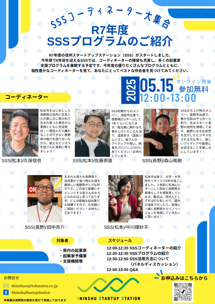 <内容>SSSの長野・松本に常駐するコーディネーターのご紹介、R7年度SSSのプログラムのご紹介、その他、起業時に活用できる県の補助金のご紹介や、SSSを利用するスペシャルゲスト(起業家)によるSSSを使い倒す方法についてパネルディスカッション形式でお話しさせて頂きます