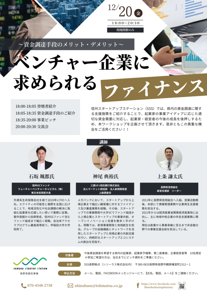 信州スタートアップステーション(SSS)では、県内の資金調達に関する支援施策をご紹介することで、起業家の事業アイディアに応じた適切な資金需要に対応し、起業家・経営者の今後の成長を後押しするため、本ワークショップを企画させて頂きます。是非ともこの貴重な機会をご活用ください!!