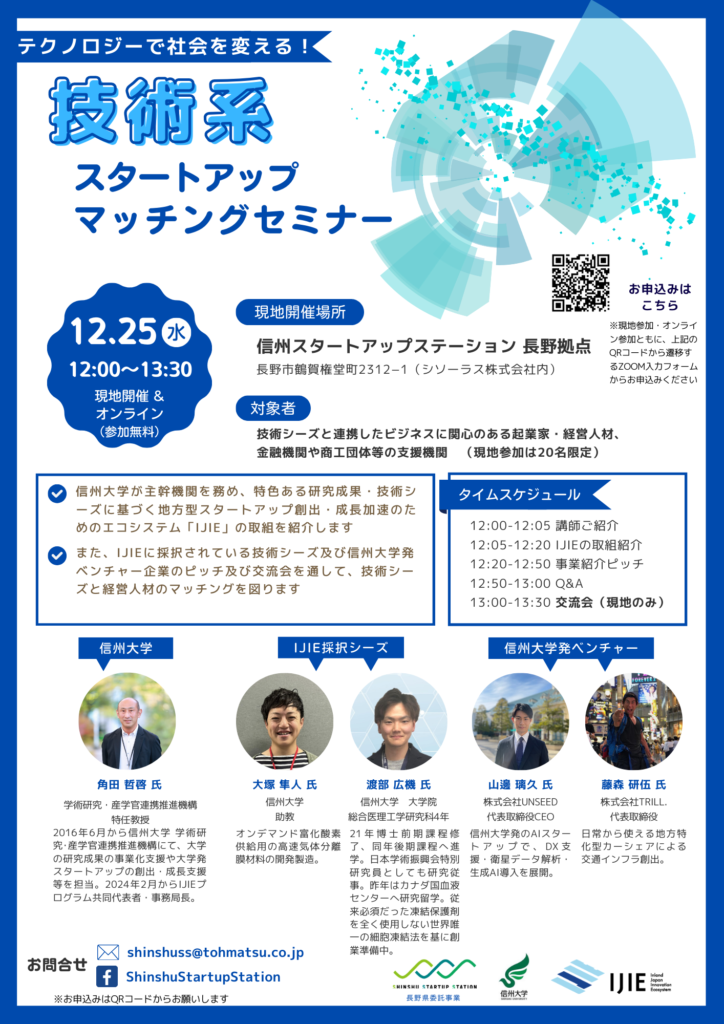 また、IJIEに採択されている技術シーズ及び信州大学発ベンチャー企業のピッチ及び交流会を通して、技術シーズと経営人材のマッチングを図ります