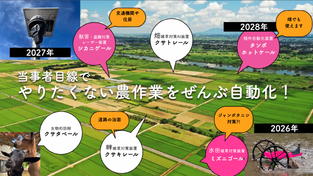 創業4年目となる現在は、水田除草だけでなく、ジャンボタニシ対策や獣害対策など、地域の農に関する課題を解決する事業にも取り組んでおり、日本の持続可能な農業の実現を目指しています。