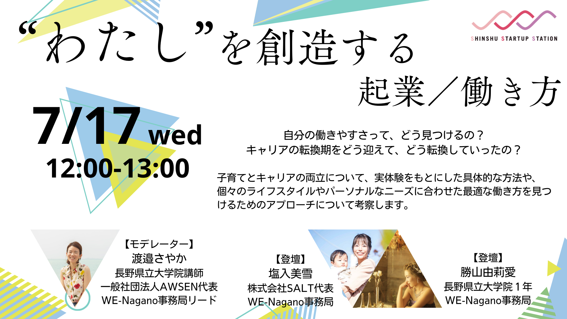 キャリアの転換期をどう迎えて、どう転換していったの?異なるキャリアに挑戦する際の成功事例や失敗談を通じて、キャリアの変革をしていった長野のSSSWの事務局メンバー。子育てとキャリアの両立について、実体験をもとにした具体的な方法や、個々のライフスタイルやパーソナルなニーズに合わせた最適な働き方を見つけるためのアプローチについて考察します。